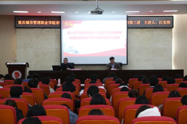 12月22日,重庆城市管理职业学院学习党的十九届五中全会精神“青年讲师团”成立大会在办公楼第一会议室举行。团市委党组成员、副书记江光伟,校党委委员、纪委书记杨寿康,校党委组织部部长付海涛,校党委学生工作部部长、学生处处长徐颖,校党委宣传部副部长刘峰久、校团委书记张毓威以及各二级学院团总支书记、青年讲师团成员、2020年“青年马克思主义者培养工程”大学生骨干培训班全体学员参加了成立大会。