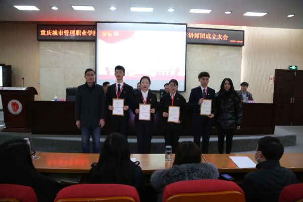 成立大会在庄严肃穆的国歌声中拉开序幕。学校党委组织部部长付海涛宣读 “青年讲师团”工作方案;党委学生工作部部长、学生处处长徐颖,党委宣传部副部长刘峰久为讲师团代表颁发聘书;团市委党组成员、副书记江光伟为“青年讲师团”授旗。