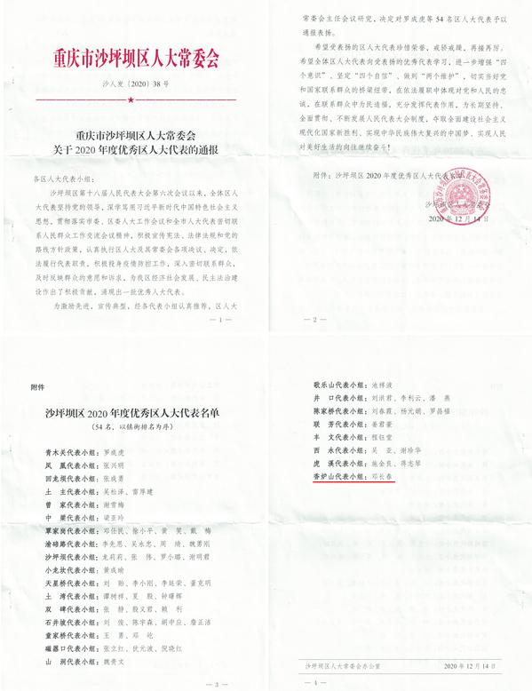 近日,重庆市沙坪坝区人大常委会发文通报表彰2020年度优秀区人大代表人员名单,我校通识教育学院教师、沙坪坝区人大代表、民盟盟员邓长春教授获得表彰。