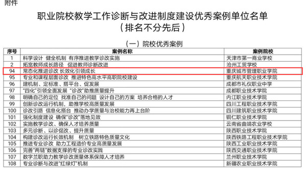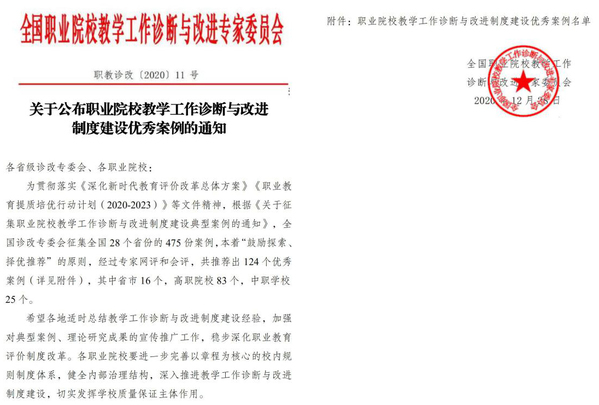12月28日,全国职业院校教学工作诊断与改进专家委员会印发《关于公布职业院校教学工作诊断与改进制度建设优秀案例的通知》(职教诊改〔2020〕11号),我校推报的学生层面诊改案例《常态化推进诊改 长效化引领成长》被评为优秀典型案例。