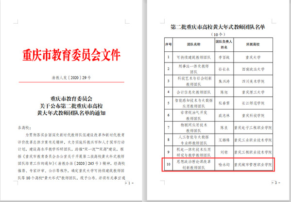近日,重庆市教育委员会印发《关于公布第二批重庆市高校黄大年式教师团队名单的通知》。根据《通知》精神,我校马克思主义学院院长喻永均教授领衔的“思想政治理论课改革创新教师团队”成功入选,系全市高职院校思想政治理论课领域唯一入选团队。