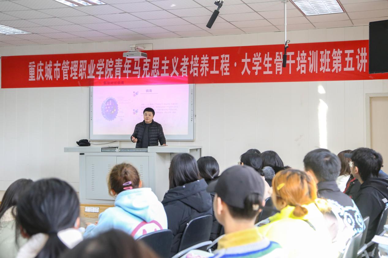 1月12日,我校“2020年青年马克思主义者培养工程·第五讲—疫情防控培训”在学生素质教育中心宣讲室举行。此次培训由重庆医科大学附属大学城医院胸外科医生张祖旺主讲,学校2020年青年马克思主义者培养工程·大学生骨干培训班全体学员参加。培训由团委书记张毓威主持。