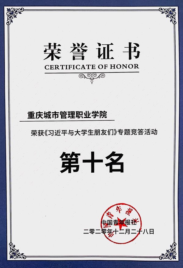 日前,中国青年报社公布了首期《习近平与大学生朋友们》专题竞答活动获奖名单,我校荣获《习近平与大学生朋友们》全国专题竞答活动第十名。活动从2020年12月14日开始,共持续两周,全国众多高校积极参与,竞答人次超过265万人,最终,共有10所高校获奖。