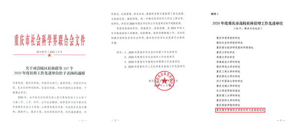近日,重庆市社会科学界联合会下发《关于对涪陵区社科联等107个2020年度社科工作先进单位给予表扬的通报》(渝社联发〔2021〕2号),对2020年度全市社科工作先进单位给予通报表扬。我校科研与发展规划处荣获2020年度重庆市高校社科管理工作先进单位。据悉,我校是全市唯一一所获此殊荣的高职院校。