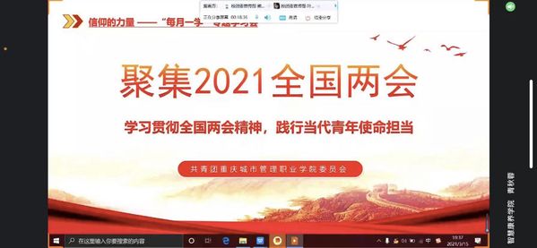 为引导我校青年学生深刻领会、准确把握两会的精神实质,加深青年学生对两会精神的认识,3月15日,校团委运用学校“青马工程——红色先锋成长计划”,组织学校各二级学院团总支书记、青年师生代表开展了云端 “信仰的力量·每月一学·团总支书记讲团课”——聚焦全国两会,牢记时代使命专题学习会。