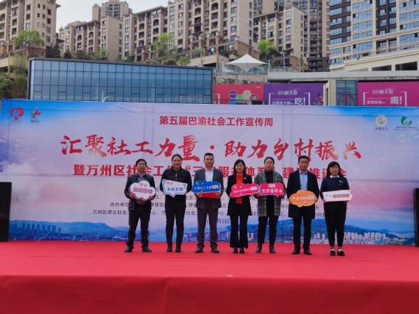 为贯彻落实习近平总书记关于社会工作的重要指示精神,弘扬社会工作专业价值,传播助人理念,展示社会工作发展成果,提高公众对社会工作的知晓度,3月19日,由重庆市万州区民政局、重庆城市管理职业学院民政与社会治理学院主办,万州明爱社会工作服务中心、万州区薄荷社会工作服务中心承办的“汇聚社工力量·助力乡村振兴暨万州区社会工作“三级服务体系”建设主题宣传活动在万州区牌楼街道石峰广场举行。我校民政与社会治理学院党总支书记陶军屹和社会工作专业带头人、党支部书记李飞虎参加了此次活动。