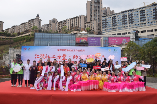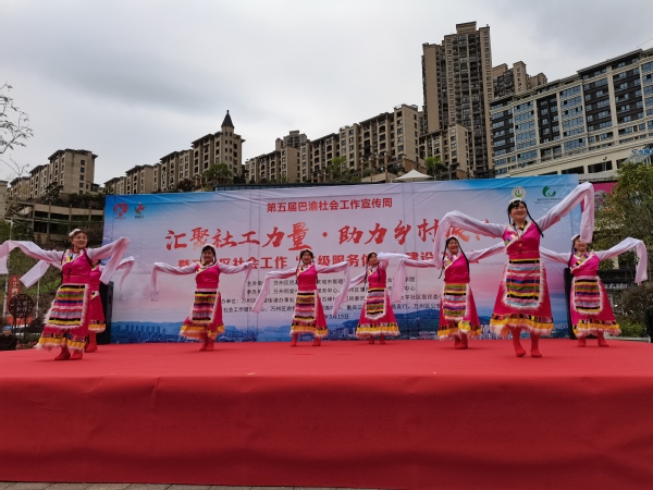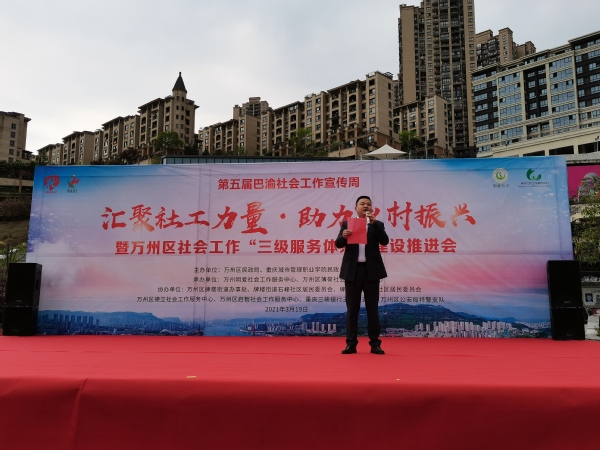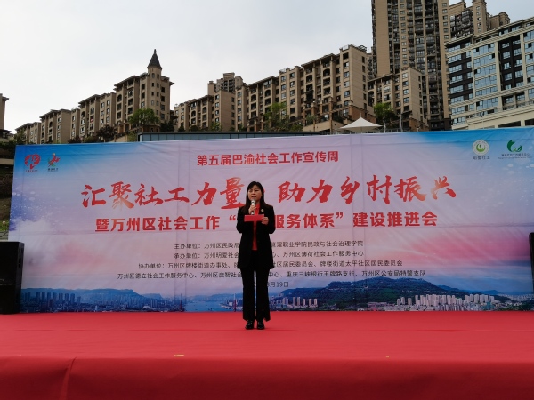 活动在精彩的舞蹈表演下拉开帷幕,万州区民政局基层政权建设科向爱清科长介绍了近年来万州区社会工作发展以及社会工作在参与城乡社区治理、服务弱势人群、助力精准扶贫等方面取得的成绩,强调万州将以社会工作“三级服务体系”建设为契机,加大政府购买社会工作服务力度,完善社会工作服务机制,提升社会工作服务效能,表彰激励社会工作专业人才,为社会工作发展营造良好生态和氛围。随后,陶军屹书记宣布“汇聚社工力量·助力乡村振兴”第五届巴渝社会工作宣传周暨万州区社会工作“三级服务体系”建设主题宣传活动正式开始。