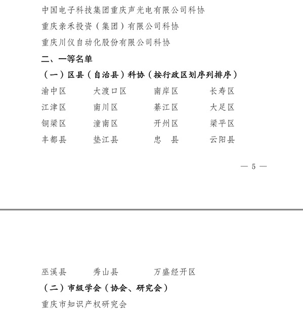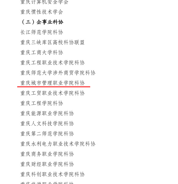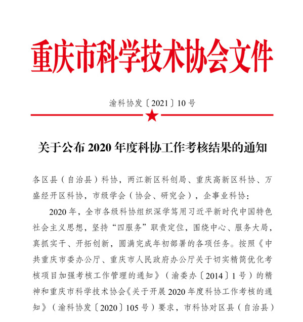 近日,重庆市科学技术协会印发了《关于公布2020年度科协工作考核结果的通知》(渝科协发〔2021〕10号),我校科协荣获一等奖。这是学校自2014年以来连续六年荣获该奖项。