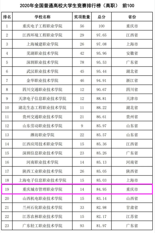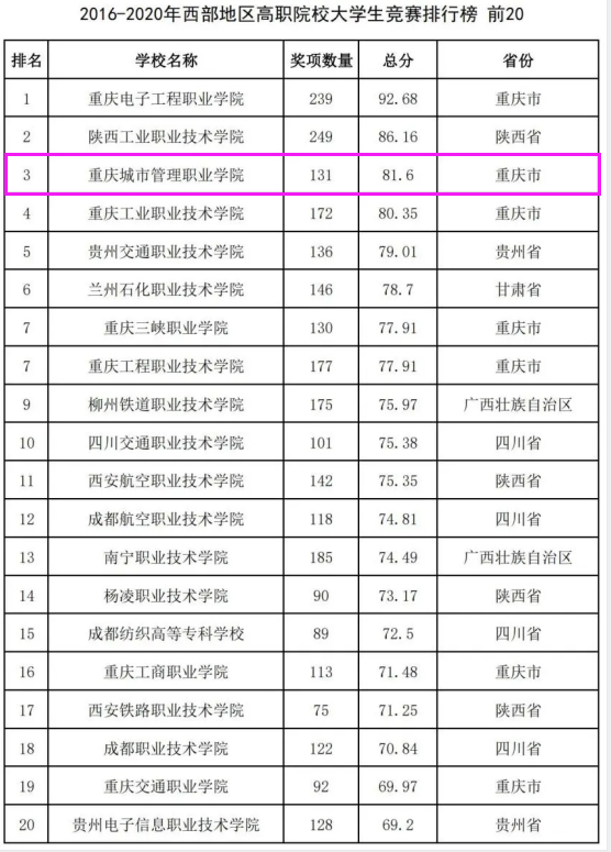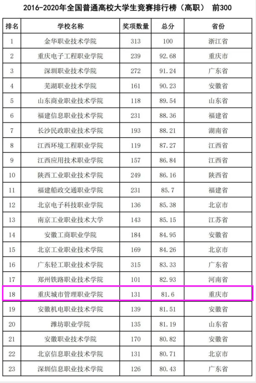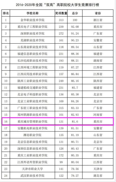 近日,中国高等教育学会高校竞赛评估与管理体系研究工作组发布2020全国普通高校大学生竞赛排行榜。重庆城市管理职业学院以131个奖项、81.6分的成绩排名2016-2020年全国普通高校大学生竞赛排行榜(高职)第18名,位列重庆市属高职院校第2名。