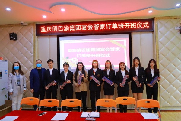 开班仪式上,陶军屹书记宣读了订单班成员名单及介绍班导师和辅导员。本订单班由贾丽彬老师担任班导师,王颖辰老师担任辅导员。重庆俏巴渝集团有限公司领导向每位同学授徽,欢迎同学们加入俏巴渝的大家庭中。刘亮总经理向大家介绍了集团的发展概况,对同学们的加入表示欢迎,希望同学们能够好好学习,加强实践,为自我成长成才,为公司发展贡献力量。婚庆A2001级胡帅同学作为学员代表发言并表态,十分感谢学校和企业为婚庆专业学生搭建专业学习和实践的平台,坚定认真学习的决心,不负学校和企业的培养和鼓励。