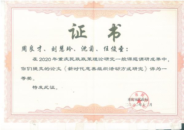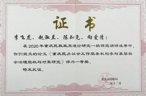 会议通报了2020年度全市政策理论研究成果获奖情况,我校李飞虎同志主持的《重庆民办社会工作服务机构参与基层社会治理现状与对策研究》、周良才同志主持的《新时代慈善组织活动方式研究》荣获一等奖,获奖数量位居全市各民政直属单位、民政政策研究基地第一。