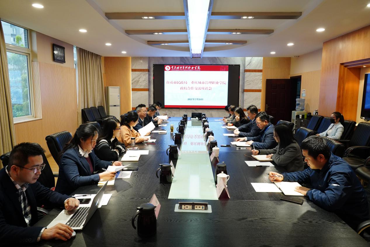 座谈会上,袁国副校长首先对黄艳峰副局长一行的到来表示热烈欢迎。他详细介绍了学校近年来的发展历程、现有成果和未来发展规划,同时表示学校大力支持与自贡市民政局开展政校合作,荣昌校区的建设也将为双方合作提供更广阔的平台。黄艳峰副局长介绍了自贡市基本情况。他认为我校专业建设成效显著,特别聚焦职业教育、专注社会治理实务领域,希望能与我校在社工人才培养、专家库建设、优秀学生实习就业等多方面达成合作,在成渝双城经济圈建设背景下,共同为地方政治经济发展、基层社会治理助力。随后,田奇恒院长从专业设置、人才队伍、社会服务、行业影响、教研科研、毕业生质量等方面详细介绍了民政与社会治理学院及专业群建设基本情况。陶军屹书记感谢自贡市民政局对学院毕业生的认可和信任,表示学院将会保持与民政系统的密切联系,为加强和创新成渝两地基层社会治理培养更多优秀人才。