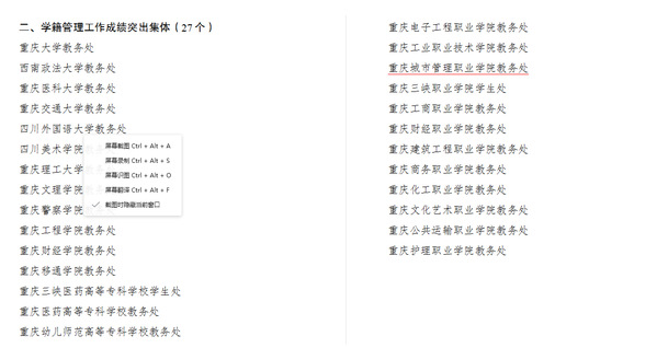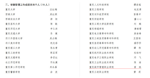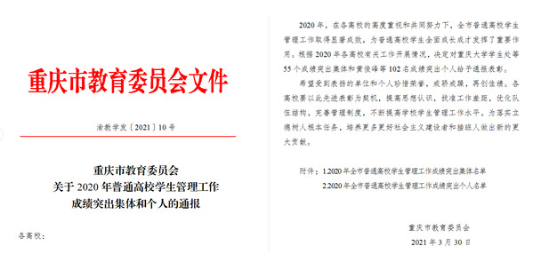 近日,为表彰2020年重庆市普通高校学生管理工作取得的显著成效,重庆市教育委员会下发了《关于2020年普通高校学生管理工作成绩突出集体和个人的通报》(渝教学发〔2021〕10号),我校教务处荣获重庆市普通高校“学籍管理工作成绩突出集体”,教务处运行科科长曾珠被评为“学籍管理工作成绩突出个人”。