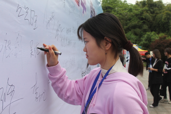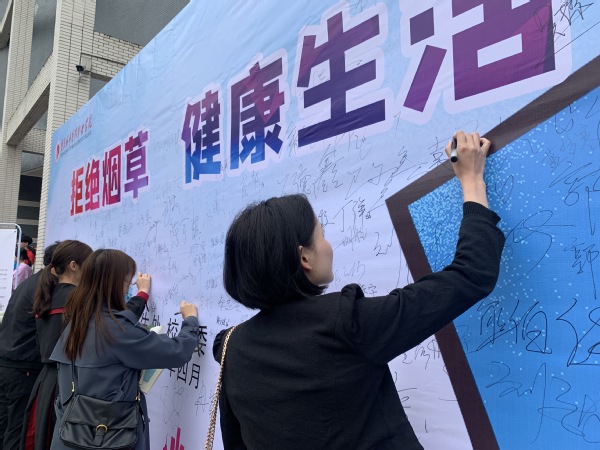 一名正准备点燃香烟的同学看到倡议后,主动收回了香烟。他说,自己时常会不自觉地在校园公共场所过一下“烟瘾”,今天看到学校的活动倡议后,感觉自己的行为很不妥。说完,他还毫不犹豫地在签名墙上签下了自己的名字。