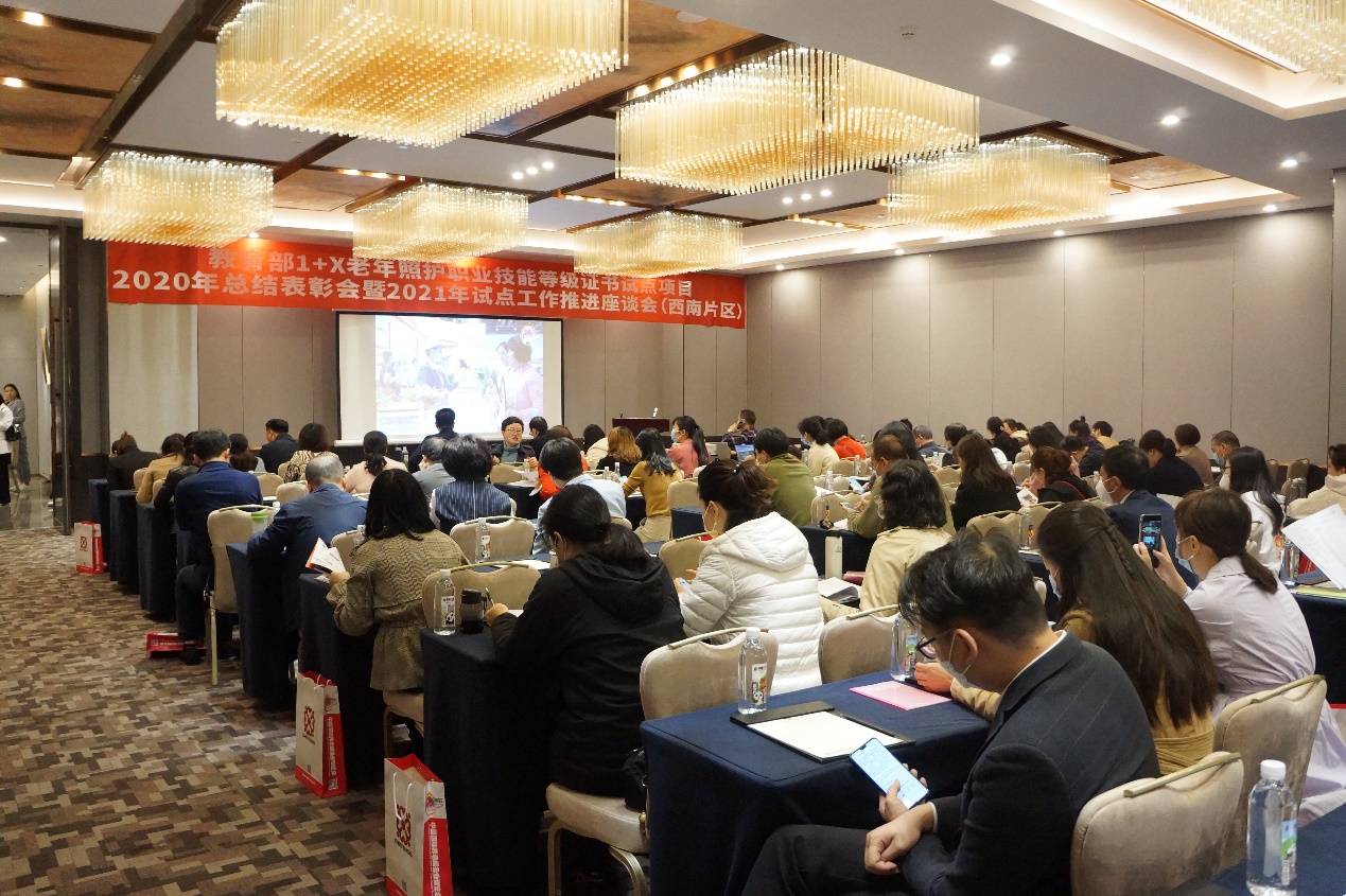4月9日,教育部1+X老年照护职业技能等级证书试点项目2020年总结表彰会暨2021年试点工作推进座谈会(西南片区)在四川成都召开,来自重庆、四川、湖北、云南、贵州五个省(市)考评站和试点院校受邀参加表彰座谈会。我校智慧康养学院教师参加会议,并作为代表发言。