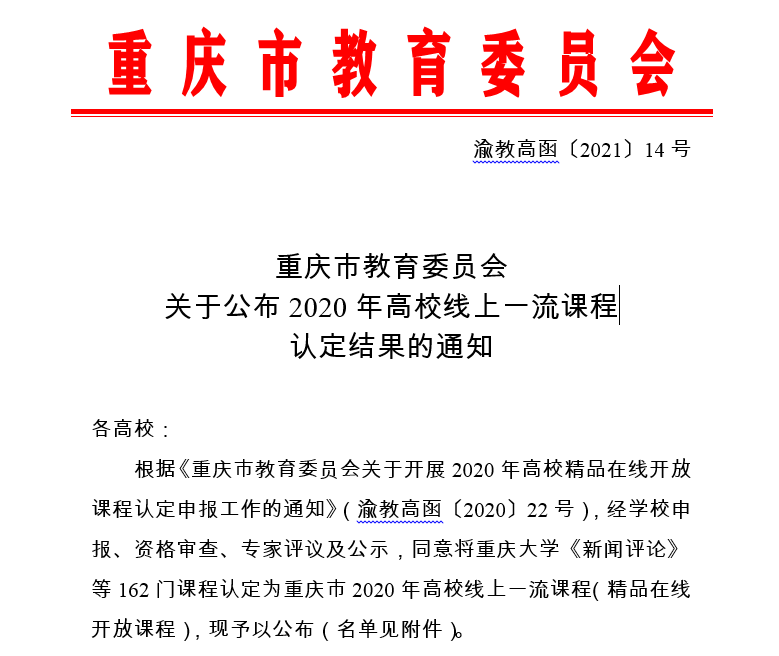 4月7日,重庆市教育委员会发布了《关于公布2020年高校线上一流课程认定结果的通知》(渝较高函〔2021〕14号),公布了162门重庆市2020年高校精品在线开放课程名单,我校4门课程获批为市级一流课程的在线开放课程。