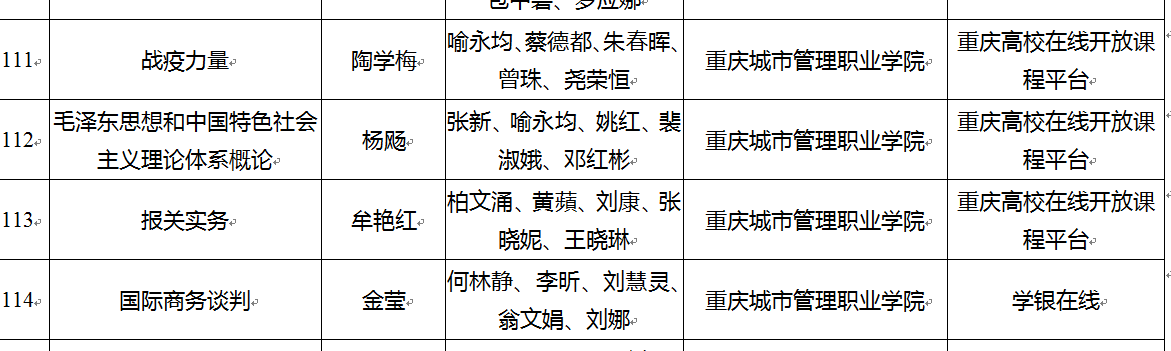 入选的4门课程分别是来自教务处陶学梅负责的《战疫力量》,马克思主义学院杨飏负责的《毛泽东思想和中国特色社会主义理论体系概论》,商学院牟艳红负责的《报关实务》及商学院金莹负责的《国际商务谈判》。