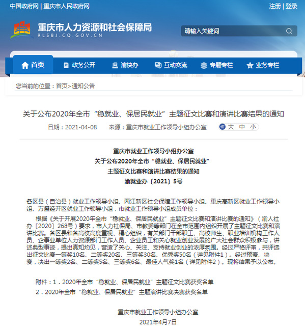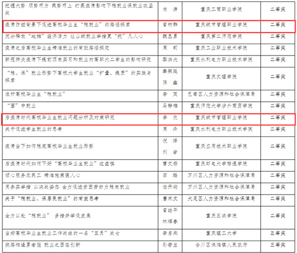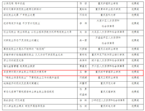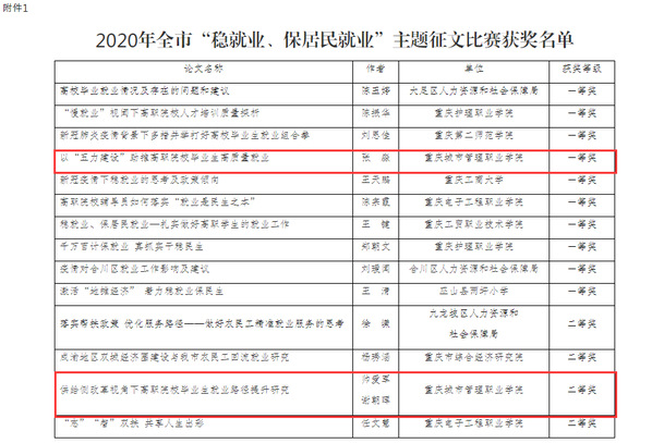 日前,重庆市人力资源和社会保障局公布了《重庆市就业工作领导小组办公室关于公布2020年全市“稳就业、保居民就业”主题征文比赛和演讲比赛结果的通知》(渝就业办〔2021〕5号),我校推荐的《以“五力建设”助推高职院校毕业生高质量就业》等5篇征文分别获得一等奖1个、二等奖3个、优秀奖1个,取得了推荐征文全部获得市级奖励的优异成绩。