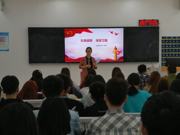 随后,任甜甜老师分别从抗美援朝战争的背景和历程、抗美援朝战争的重大意义、抗美援朝精神的当代意义三个方面进行了阐述。她详细介绍了上甘岭战役的情况,生动地还原了战场的激烈场面,深情讲述了拼却此身为胜利的特级英雄杨根思、舍身堵枪眼的特级英雄黄继光、在烈火中永生的一级英雄邱少云等英雄故事。她指出抗美援朝战争的伟大胜利,是中国人民站起来后屹立于世界东方的宣言书,是中华民族走向伟大复兴的重要里程碑,对中国和世界都有着重大而深远的意义。抗美援朝战争锻造形成的伟大抗美援朝精神,就是祖国和人民利益高于一切的爱国主义精神,舍生忘死的革命英雄主义精神,不畏艰难困苦的革命乐观主义精神,它将激励中国人民和中华民族克服一切艰难险阻、战胜一切强大敌人。希望同学们崇尚英雄、学习英雄、大力弘扬英雄精神,将这些跨越时空、历史弥新的伟大精神,永续传承、世代发扬。