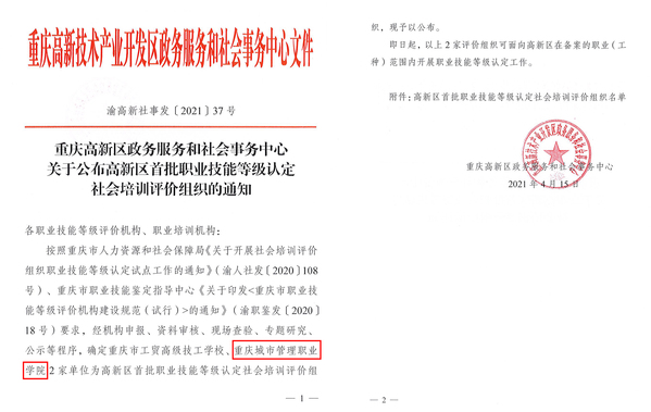 4月15日,根据重庆高新区政务服务和社会事务中心《关于公布高新区首批职业技能等级认定社会培训评价组织的通知》(渝高新社事发〔2021〕37号)精神,我校被确定为高新区首批职业技能等级认定社会培训评价组织。
