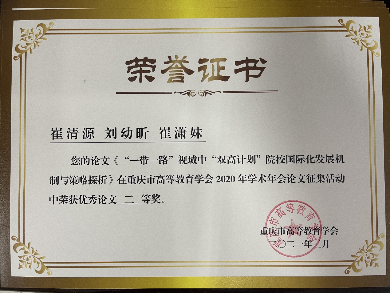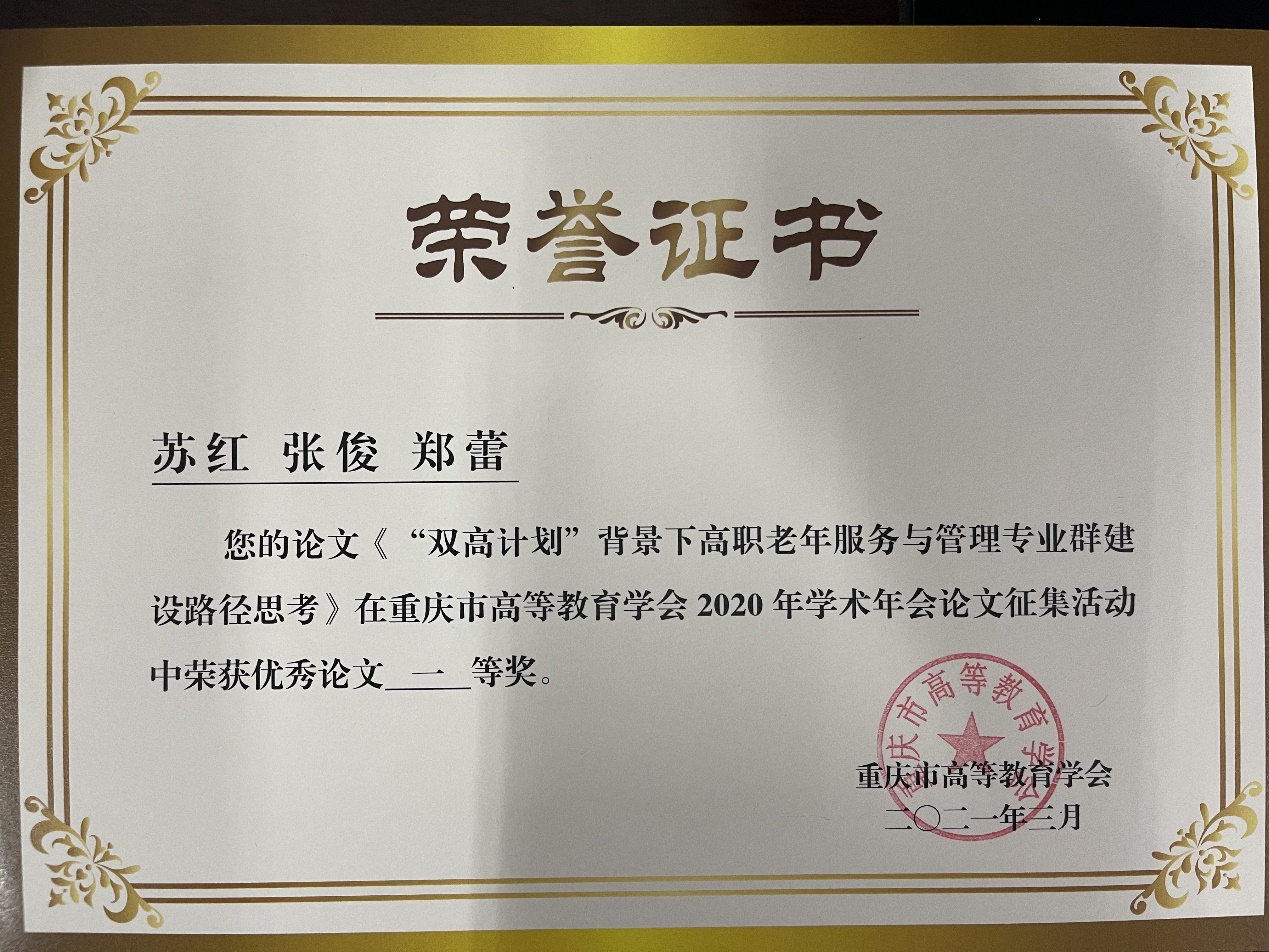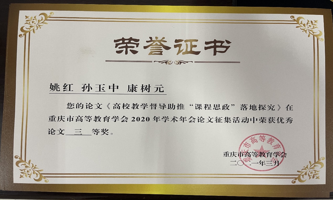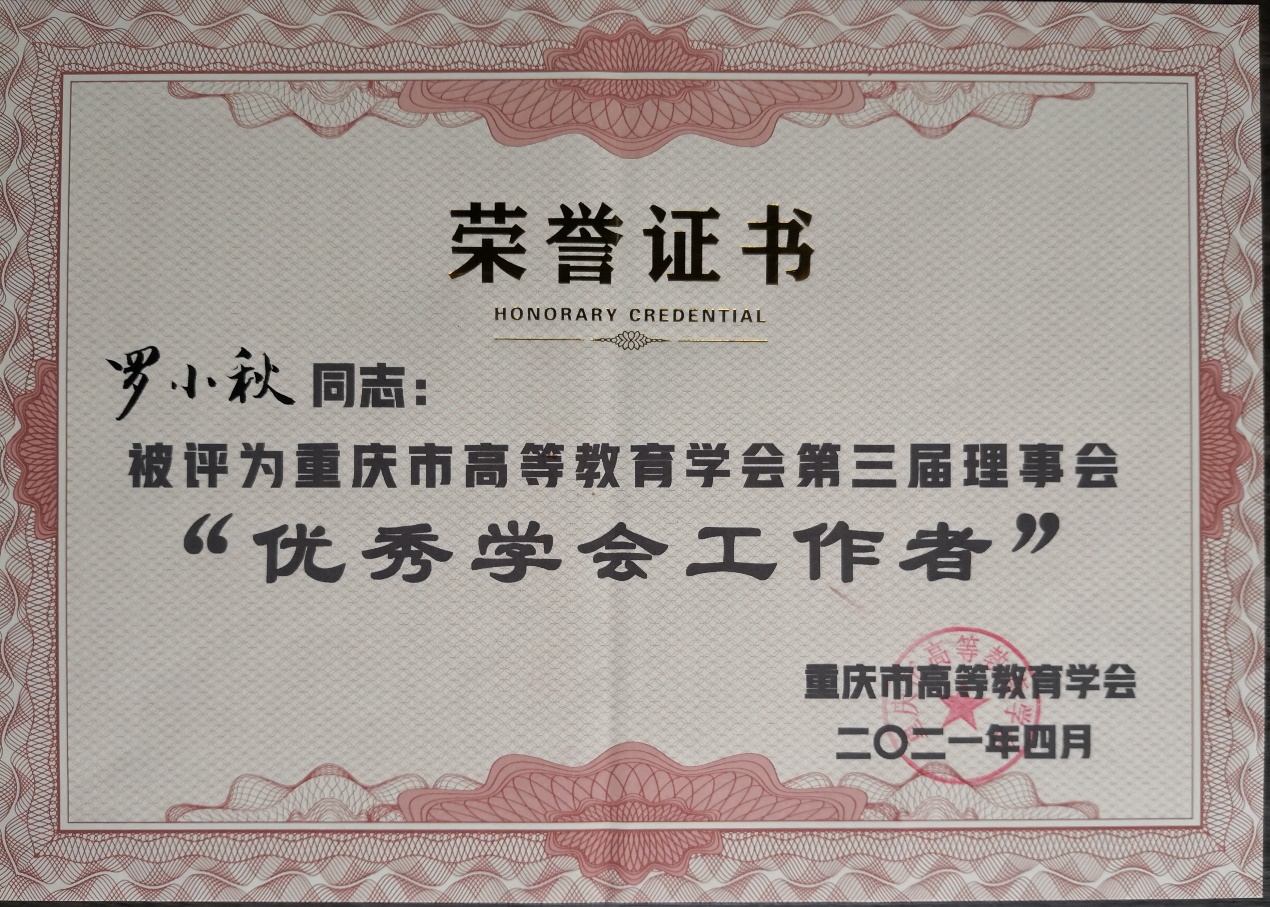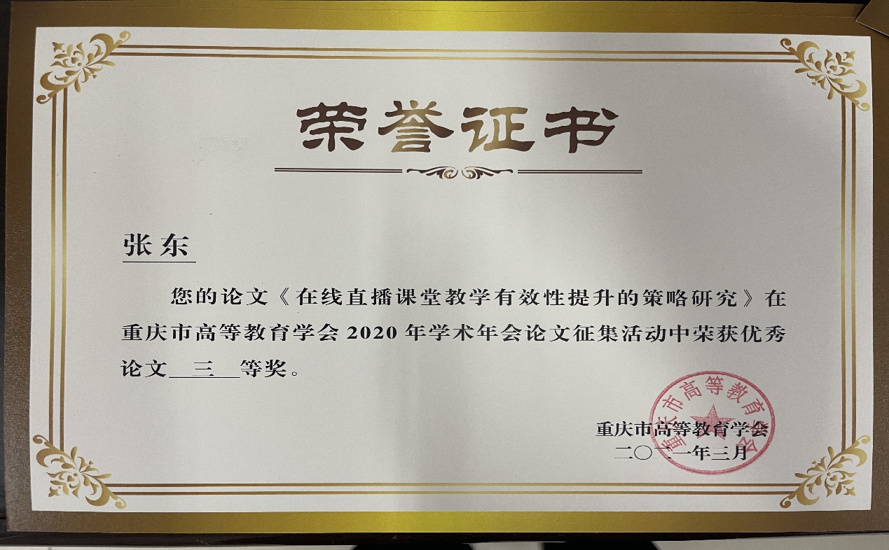 会议表彰了“第三届理事会优秀学会工作者”,我校副校长罗小秋荣获“第三届理事会优秀学会工作者”荣誉称号,同时,宣读了“重庆市高等教育学会2020年学术年会优秀论文评选结果的通知”,本次入选论文142篇,其中一等奖10篇,二等奖24篇,三等奖35篇。我校苏红等3人撰写的论文《“双高计划”背景下高职老年服务与管理专业群建设路径思考》获得一等奖,崔清源等3人撰写的论文《“一带一路”视域中“双高计划”院校国际化发展机制与策略探析》获得二等奖,姚红等3人撰写的论文《高校教学督导助推“课程思政”落地探究》和张东撰写的论文《在线直播课堂教学有效性提升的策略研究》获得三等奖。