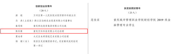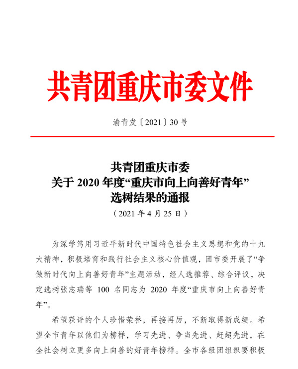 4月25日,共青团重庆市委下发了《关于2020年度“重庆市向上向善好青年”选树结果的通报》(渝青发〔2021〕30号),我校学生范佳宾当选为“重庆市向上向善好青年”(扶贫助困好青年),我校2015级校友陈科霖当选为“重庆市向上向善好青年”(创新创业好青年)。该荣誉的获得,展现了我校大学生勤于学习、善于思考,躬行实践、积极创造,乐于服务、甘于奉献的良好精神风貌;反映了我校积极弘扬主旋律、传播正能量,践行社会主义核心价值观的良好校园文化氛围。