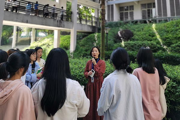 4月29日,重庆城市管理职业学院文化传播专业群党支部书记杨洁正在教学楼树荫下给学生们分享党史故事,引来路过的同学一起聆听学习。像这样在校园的不同地方,老师们利用碎片时间分享党史故事的场景常常可以看到。