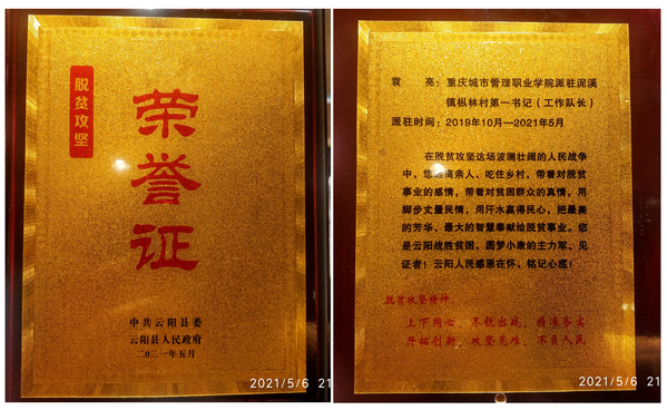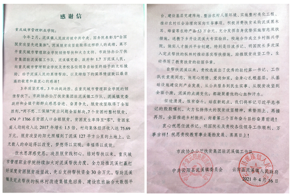“泥溪脱贫攻坚能取得这样骄人的成绩,离不开重庆城市管理职业学院倾情帮扶和大力支持......”近日,市政协办公厅扶贫集团驻泥溪镇工作队、云阳县泥溪镇人民政府向我校送来感谢信,对我校助力云阳县脱贫攻坚表示衷心的感谢。