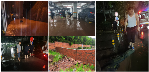 22:30左右,暴雨来袭,不到半小时,学校北门公路、食堂及充值中心、致用楼车库、扩建工程临时围墙等地开始大规模积水,随着雨量的增加,现场情况越来越难以控制,出现了危急道路、车辆、财产等安全灾情。基建后勤处会同大正物业深入防汛抢险第一线,紧急展开处置工作:抢险人员兵分老校区、扩建校区两路抢险,紧急联系致用楼停车库内车主挪车、打开检查所有雨水井盖助推顺畅排水;对配电室、教学楼园区路口等低洼区域进行沙袋防堵减缓水势蔓延压力;组织人员准备更多的防洪物资和备用水泵减缓积水水位上升;及时清理落叶、垃圾等杂物防止堵塞排水口。经过3个多小时的奋战,积水严重的致用楼车库和学生食堂积水得到引流缓解。