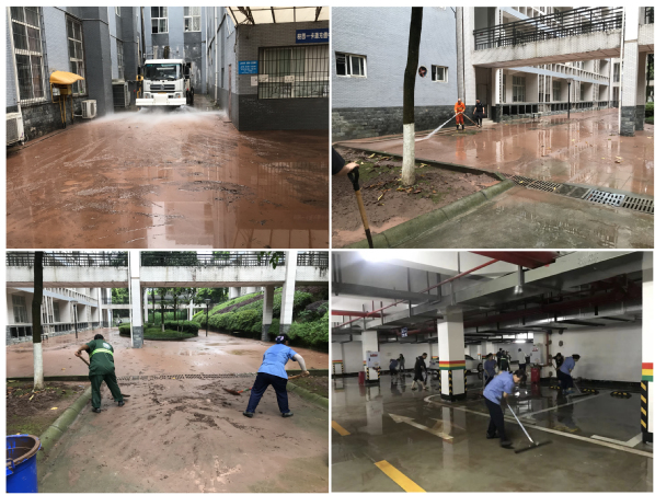 暴雨过后,校园里面到处淤泥、垃圾四散,绿化带树枝掉落成堆,出现了防疫帐篷、减震带等物资损坏情况。为迅速恢复校园正常秩序,基建后勤处组织大正物业人员、基建维修人员、绿化养护人员利用周末休息时间,对校区进行全面检查,清除淤泥、冲洗地面、检查井盖、修复损坏设备等系列工作,确保周一师生正常行课。截止目前,校园一切恢复正常。