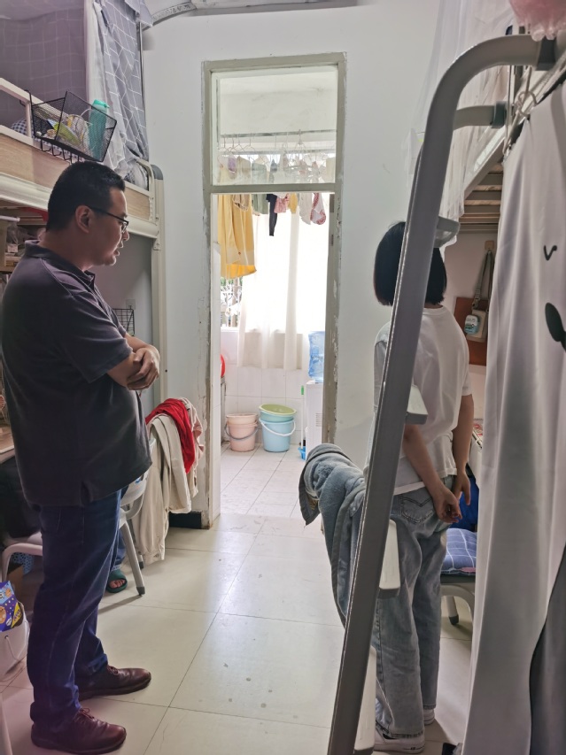 交流结束后,赵于熙一行去到学生公寓G栋与学生进行垃圾分类交流,到学生公寓GH栋垃圾分类回收亭现场查看学生垃圾分类投放,到学校垃圾回收转运站检查我校其他垃圾的压缩和可回收物的二次分拣,到食堂检查厨余垃圾的装运、回收并现场询问厨余垃圾回收的状况。