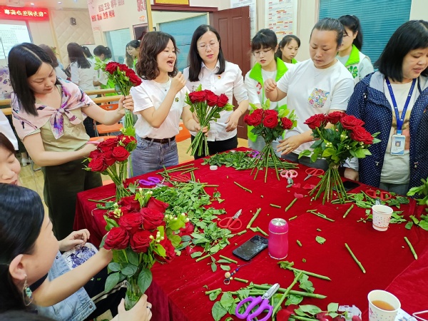 来自婚庆专业的余长惠老师为大家简要介绍了本次活动所用的花材和基本技法,并对前两个步骤进行了演示。本次花艺制作主要选用探险者红玫瑰,辅以茉莉花进行花束制作。入党积极分子薛盈璇同学介绍了花束包装流程,展示了包装纸的包装方法,并分享了自己的包装小技巧。在学生志愿者的协助下,老师们纷纷动手尝试,现场氛围十分活跃。通过师生的通力合作,在不到一小时的时间中,每位教师都完成了手中的花束作品,也纷纷兴致勃勃地分享了自己的感受。长期从事学生工作的敖玲敏老师说:“第一次自己包花,很有成就感,也感受到了插花魅力,插花真的能给我减压!”专任教师黄静说:“通过此次活动感受到花艺的魅力,不仅是美的享受,也能给我们带来内心的平静,在钢筋水泥的城市里亦能触摸到自然。谢谢党组织对我们的关爱!”老师们表示,尝试花艺能陶冶情操,让自己心境平和,更提高了自身精神文化素养。