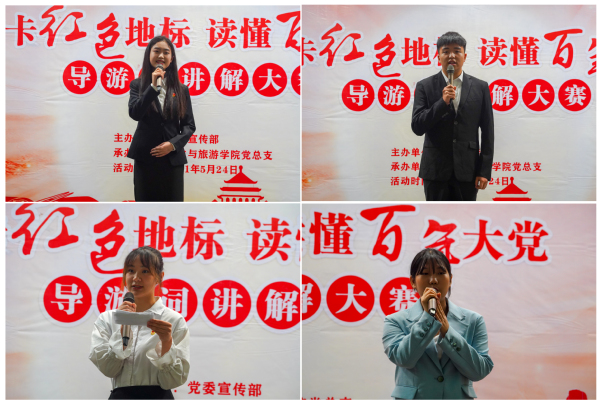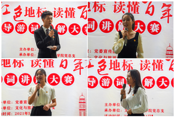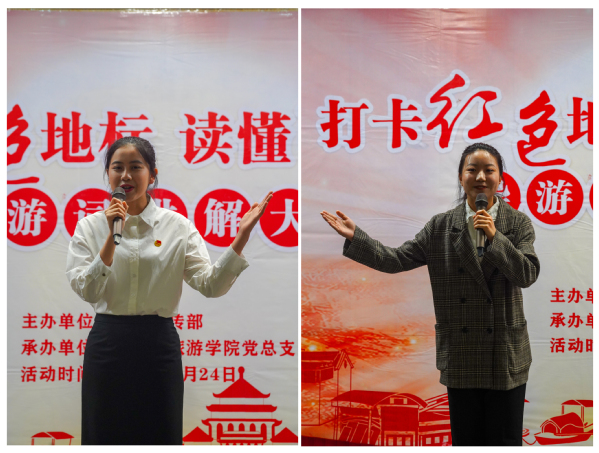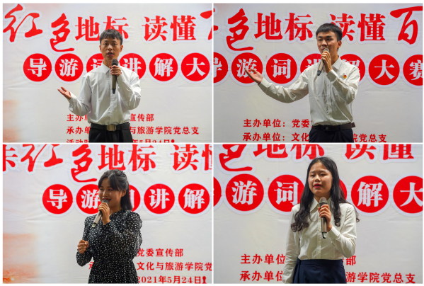 比赛中,来自各二级学院的14名参赛选手精神饱满,声情并茂,用抑扬顿挫的语调,铿锵有力的气势,热情饱满的情感将在场师生一次次带入到激昂的情绪之中,恰如身临其境,真切感受到了党的百年艰辛奋斗历程,领悟到了中国共产党始终牢记初心不忘使命,一步步实现国家富强的宏伟目标,追求民族复兴的伟大梦想的使命担当。文化与旅游学院的杨和坤为我们讲解了河南新县,让大家对鄂豫皖革命根据地和这个走出了43位将军和50位省级领导干部的将军县有了更加深刻的认识。商学院的包艳玲同学为我们讲解了浙江的嘉兴,浙江嘉兴的一艘小小红船,承载着“开天辟地、敢为人先的首创精神,坚定理想、百折不挠的奋斗精神,立党为公、忠诚为民的奉献精神。”其他参赛选手陆续带领大家“走近”陕西赵金、湖南郴州、北京香山、贵州遵义、江苏徐州、山东临沂、宁夏将台堡、江西于都、安徽金寨、山西吕梁、河北西北坡、福建古田等红色革命圣地,一次次接受革命精神的洗礼。