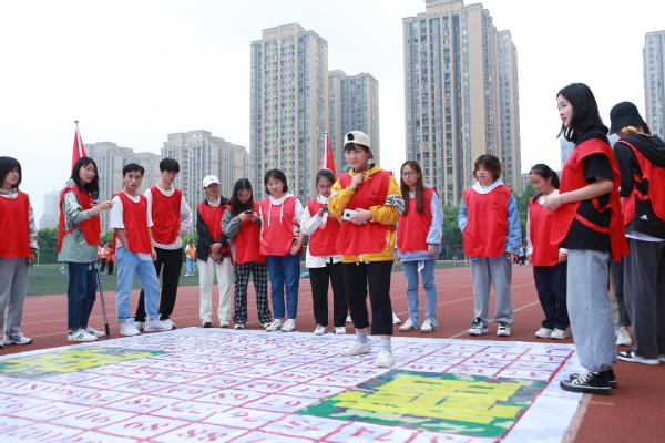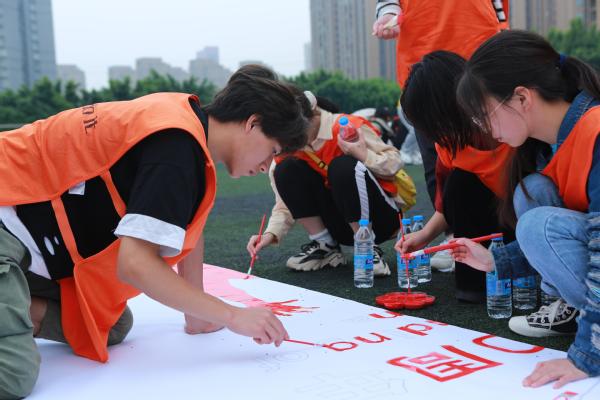 各项挑战项目结束后,全场师生共同开启了“共绘蓝图”任务。12支队伍的同学们积极配合、分工协作,共同完成物料选取、布局设计、颜色涂抹等,最终将12幅小画布共同拼接成“小我融入大我 青春献给祖国”巨幅画卷。画卷的震撼效果将整场活动推向高潮,现场欢声笑语、气氛热烈,活动热情不断高涨。