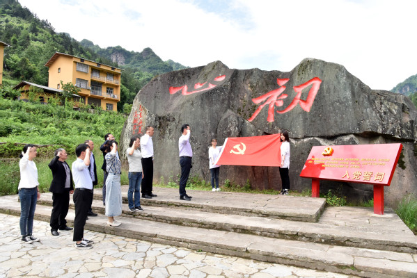 今日的华溪村,公路蜿蜒、小道洁净,一栋栋村舍星罗棋布,一株株黄精茁壮生长,一簇簇鲜花娇艳绽放,处处展现山清水秀、生机盎然的美丽乡村景象。沿着习近平总书记的足迹,两校党员们一起拜访了老党员马培清同志,听她为我们讲述2019年习近平总书记来华溪村举行院坝会的情形。在脱贫户谭登周家里,大家实地了解和感受了谭登周家庭的巨大变化。在县委党校中益校区,大家一起参观了习近平总书记领导脱贫攻坚伟大实践历程展,深刻感悟习近平总书记“我将无我,不负人民”的人民情怀。在初心石前,大家庄严举起右手,握紧拳头,一起重温入党誓词,时刻牢记共产党人的初心和使命。