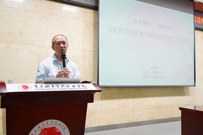 MVE网重庆讯 为深入学习贯彻习近平总书记在党史学习教育动员大会上的重要讲话精神,扎实开展党史学习教育,教育引导全校师生学史明理、学史增信、学史崇德、学史力行,进一步提升我校党建和思政工作队伍育人能力,坚守立德树人,强化使命担当,为党育人、为国育才,推动学校事业高质量发展,以优异成绩迎接中国共产党建党100周年。6月8日,全国时代楷模、大连海事大学博士生导师曲建武教授走进重庆城市管理职业学院作了《学史增信 铸魂育人 当好担当民族复兴时代重任的“大先生”》的党课报告。学校全体科级及以上干部、党支部书记、思政课教师、辅导员、党史学习教育领导小组办公室成员近200人聆听报告