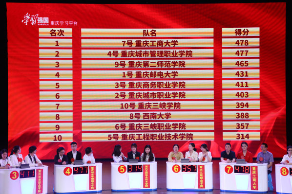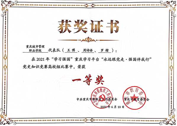 6月10日,由中共重庆市委教育工委、重庆市教委主办,重庆工商大学承办的“永远跟党走·强国伴我行”党史知识竞赛高校组比赛在重庆工商大学南岸校区举行,全市56所高校代表队参赛。我校通过层层选拔,由马克思主义学院教师王博、民政与社会治理学院学生周诗语、文化与旅游学院学生罗楷组成代表队,最终以总分477分的优异成绩位居第二名,荣获一等奖。