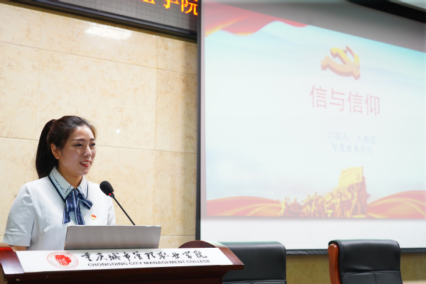智慧康养学院辅导员王朝霞老师以《信与信仰》为题,围绕学生工作的一线实践,讲述了作为年轻党员教师进校以来在领学生成长、立德树人、启智润心的做法与体会。她重点从明理悟道、把握规律悟思想,增信强志、坚定信仰担使命,崇德修身、赓续精神苞本色,力行报国、铸魂育人显担当等方面进行了交流,声情并茂地讲述了自己指导帮扶学生、关心资助学生的典型案例,还分享了带领学生团队自创自编的原创歌曲《争当文明好学生》从拍摄到被推荐至《学习强国》重庆学习平台我爱重庆频道宣传推广的故事。王朝霞老师表示,作为年轻一代辅导员,将永葆宣誓入职时的那份冲劲儿、坚持干到凌晨时的那份拼劲儿、绽放攻坚克难时的那份闯劲儿,披荆斩棘、攻坚克难,在为党育人、为国育才的崇高事业中绽放青春光芒。