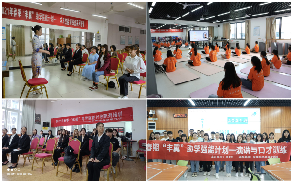 马克思主义学院、文化与旅游学院、智慧康养学院等10个单位组织开展了“学党史、践承诺、见行动”党史学习教育实践、形象管理和职场礼仪、健身健美素质拓展训练营、演讲与口才训练、英语技能提升辅导、求职技能训练营、心理素质拓展训练、职场安全与就业权益保护和音视频剪辑入门等9个子项目的培训,20余名教师主动担任“丰翼”培训项目授课教师,参与学生超3000人次。