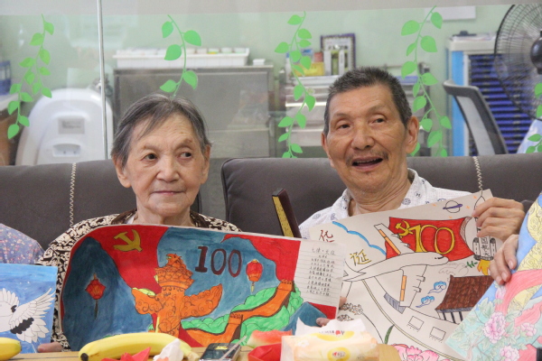 活动中,大家还手持国旗和党旗,齐唱《没有共产党就没有新中国》《唱支山歌给党听》《五星红旗》《映山红》等歌曲。熟悉的旋律跳跃在耳边,爱国之情激荡在心间,颂党之情融合在歌声中,引起了全体老人和志愿者的强烈共鸣,活动现场响起了阵阵掌声,多位老人流下了激动的泪水。一首首经典的爱党之歌、爱国之曲,抒发了大家对党的满腔热爱和迎接党的百年华诞的喜悦之情。