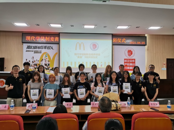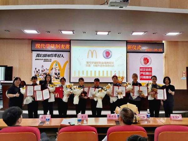 据悉,我校与麦当劳于2014年建立深度合作关系,探索试点现代学徒制人才培养,定位“餐厅总经理”岗位,先招生后招工,创新“学校与企业双主体、学生与学徒双身份、教师与师傅双指导、工作与学习双途径、技能与素养双提升、就业与职业双发展”的“六维一体”校企协同育人模式,实施3天企业实岗训练、2天学校理论学习的“3+2”工学交替人才模式改革,实岗训练,岗位成才。截至目前,已组建现代学徒制“麦苗班”9个,共育学徒150余名,在培养期内,超过90%的“麦苗”获得晋升,超过60%的学员晋升为餐厅部门经理,人才培养质量和针对性显著提升。