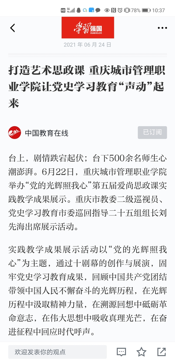 台上,剧情跌宕起伏;台下500余名师生心潮澎湃。6月22日,重庆城市管理职业学院举办“党的光辉照我心”第五届爱尚思政课实践教学成果展示。重庆市教委二级巡视员、党史学习教育市委巡回指导二十五组组长刘先海出席展示活动。