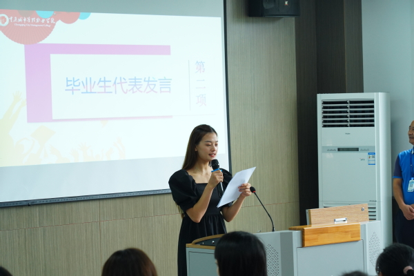 张俊院长为毕业生代表颁发毕业证书,并表达了对同学们三年来顺利完成学业的祝贺,她对本届毕业同学们高出勤率、高及格率、高毕业率给予了充分肯定;对本届毕业同学有涵养、有礼貌、有纪律给予了高度表扬;对本届毕业同学们为学校发展的点滴贡献、为学弟学妹提供的模范作用、为自身成长付出的认真和努力表达了感谢。同时,她也倚望同学们要具备更加丰富的专业基础知识和精湛的专业技术技能,希望大家在工作岗位上能够继续坚持学习,弥补自身理论的不足和不断进行知识革新。