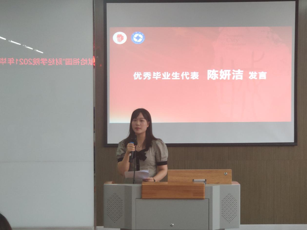 典礼从播放《我们毕业了》短片开始。短片中,学校党委书记任波,党委副书记、校长邓明国真挚的毕业寄语,给同学们深刻的启迪和思考。财经学院领导、毕业班辅导员、专任教师们真情的毕业祝福,给同学们带来内心的抚慰和温暖。同学们在校三年的学习生活时光一幕幕呈现,曾经的某个瞬间勾起大家无数美好的回忆。优秀毕业生代表陈妍洁同学回忆了自己在校三年的成长经历,表达了对母校的不舍、对老师的感谢、对重逢的期待,她衷心祝愿母校蒸蒸日上,“桃李满天下”。辅导员代表刘盛坤教师回顾了与同学们三年相处的点点滴滴,祝愿同学们坚定前进信心,立大志、明大德、成大才、担大任,用奋斗本色擦亮人生底色,勇做走在时代前列的奋斗者和开拓者,努力成为祖国建设的栋梁之才,成为堪当民族复兴重任的时代新人。教师代表杨琼宇老师回忆了与同学们在大学生活中的难忘瞬间,希望同学们坚持自己的梦想,做一个乐观自信的人,踏踏实实做事、老老实实做人。