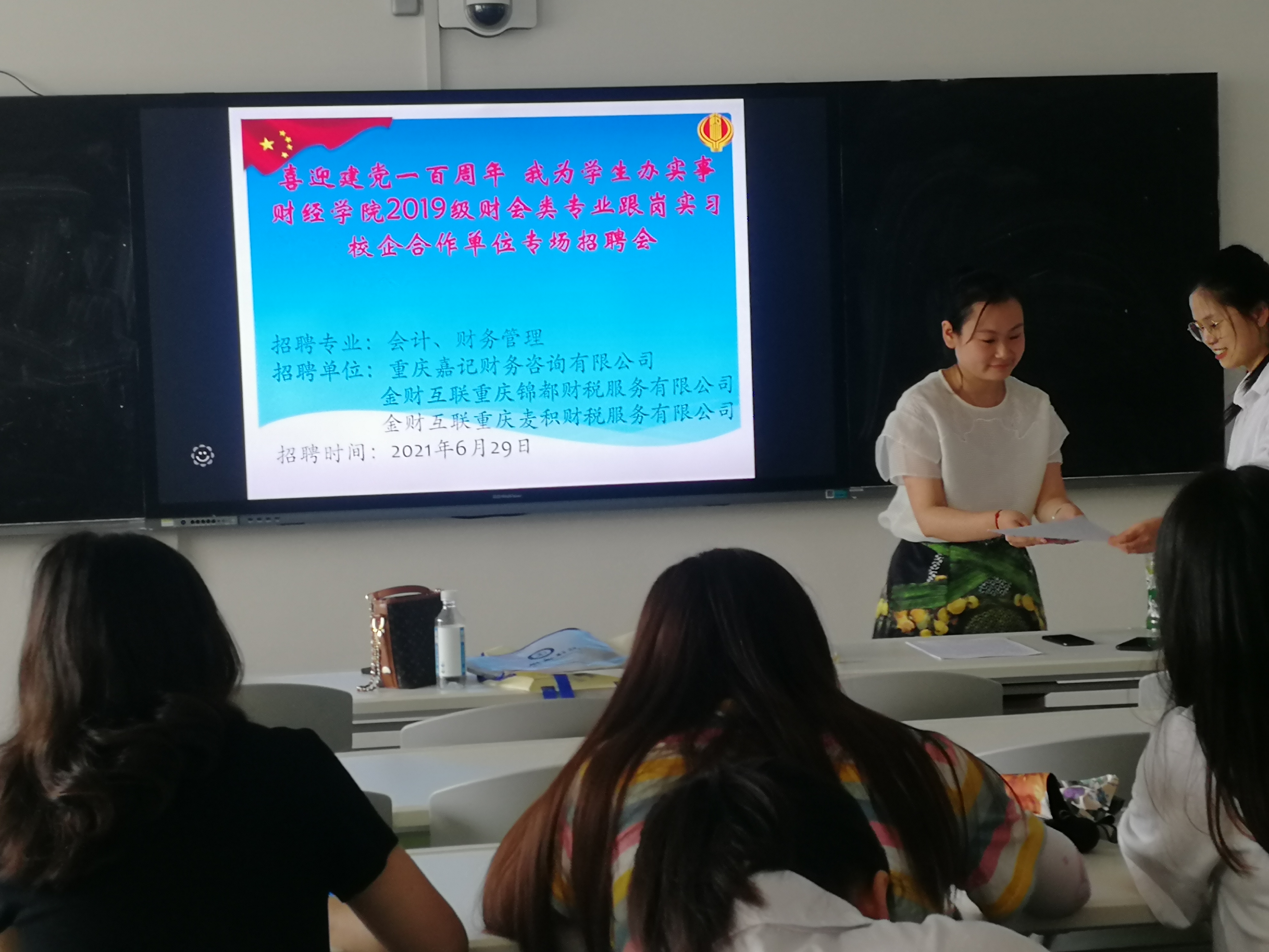 为扎实推进党史学习教育,积极开展“我为师生办实事”活动。6月29日,财经学院在致用楼C402、C404举办财会类专业跟岗实习专场招聘会。重庆嘉记财务咨询有限公司、金财互联重庆锦都财税服务有限公司、金财互联重庆麦积财税服务有限公司3家校企合作单位参与,招聘会由会计教研室唐东升教授主持。