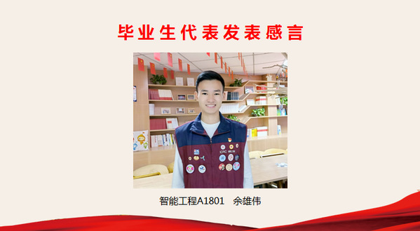 来自智能工程A1801班的毕业生代表的余雄伟在发言中说,三年里他积极投身于志愿服务的伟大实践中,走过全国10余个省市,用2300多个小时的时间服务留守儿童、乡村小学、孤寡老人。毕业后他将参与大学生志愿服务西部计划,投身到贵州省基层乡村,用实际行动助力乡村振兴,让青春之花绽放在祖国最需要的地方。接着,组织观看了各专业毕业生代表的毕业感言视频,他们真诚地感谢母校的培养和老师们无微不至的关怀,祝福母校越来越好,表示今后将不负使命、勇敢前行。院长彭勇和教师代表们也为毕业生们送上了深深的祝福,希望同学们始终不忘初心,志存高远,做爱国爱民的坚定者;勇于担当,实学实干,做知行合一的践行者,在新的征程上谱写壮丽的人生篇章。