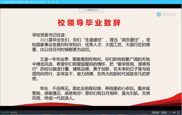 6月26日,智能工程学院2021届学生毕业典礼在云端举行,典礼以“小我融入大我 青春献给祖国”为主题,由智能工程学院党总支书记余光琳主持,身在各地的毕业生们相约云端观看了毕业典礼。