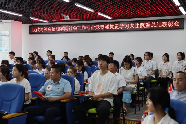 为深入学习贯彻习近平总书记在党史学习教育动员大会上的重要讲话精神,扎实开展党史学习教育,2021年4月以来,我校重庆市高校党建工作样板支部社会工作专业党支部以专业班级为单位、以入党积极分子为主体、以教师党员为督导,组建了党史故事等10个党史学习小组。7月6日,社会工作党支部在致用楼A401召开党史学习大比武暨总结表彰会。学校党委相关职能部门负责人,民政与治理学院党党政负责人、支部党员教师及党史学习小组成员共计110余人参加活动。