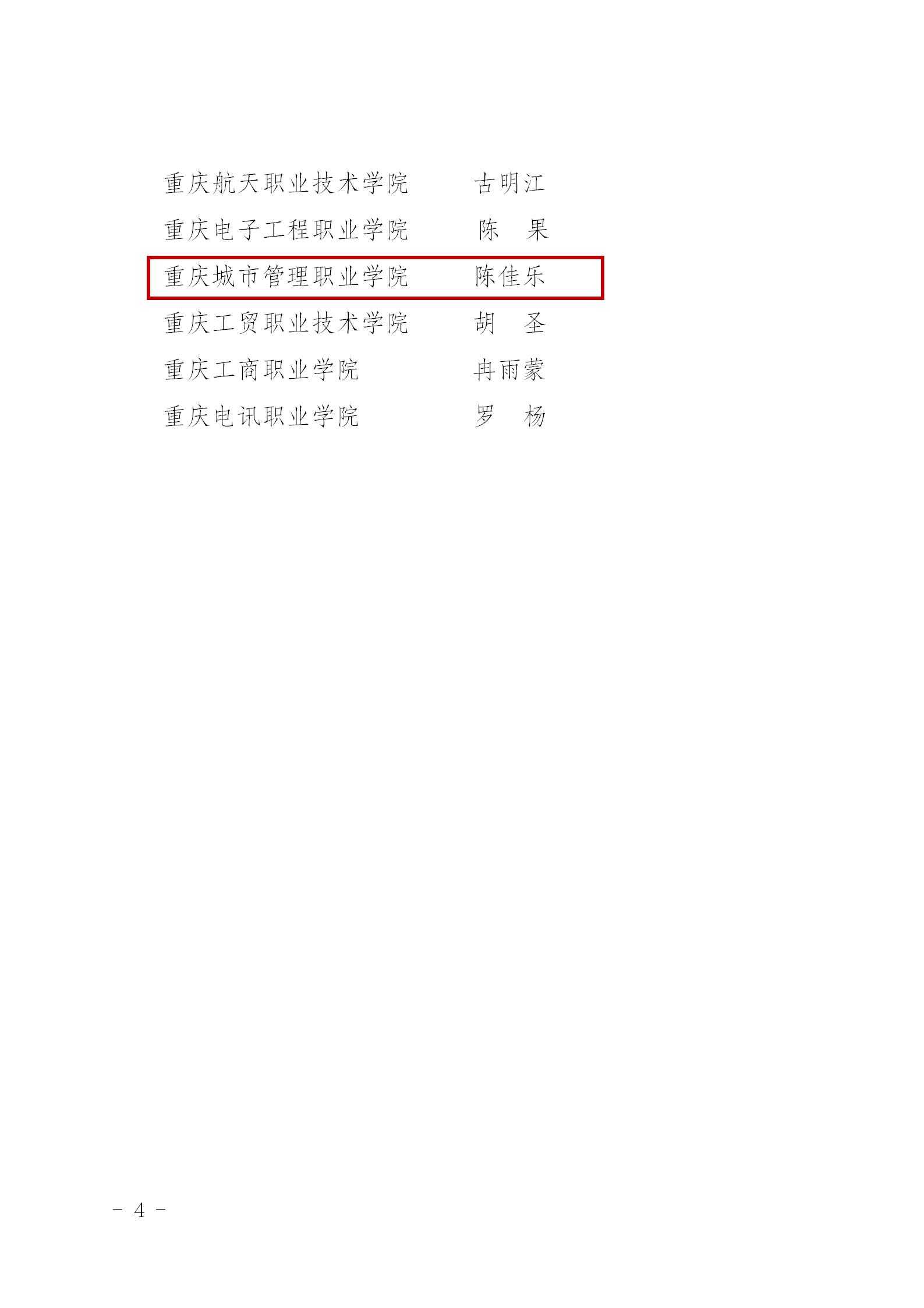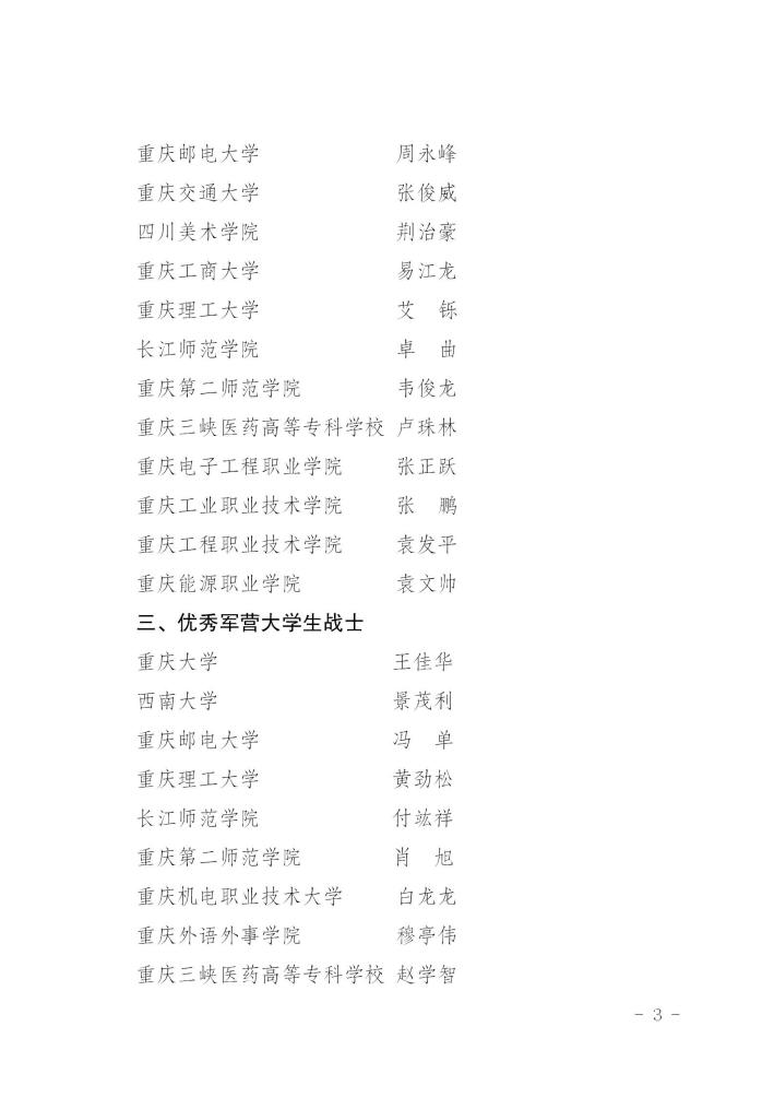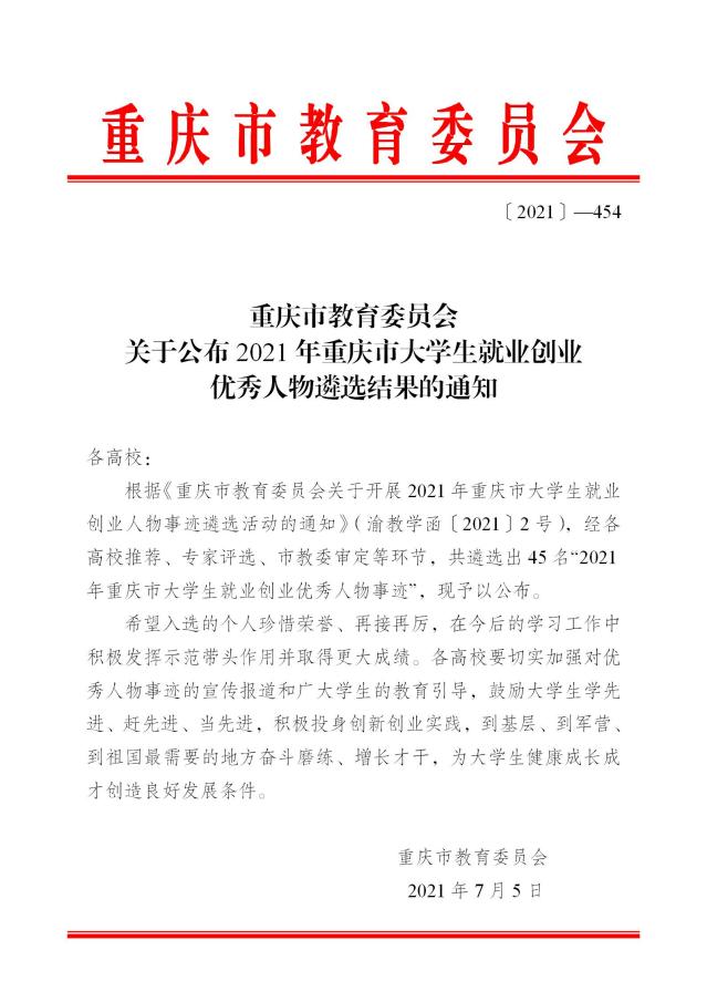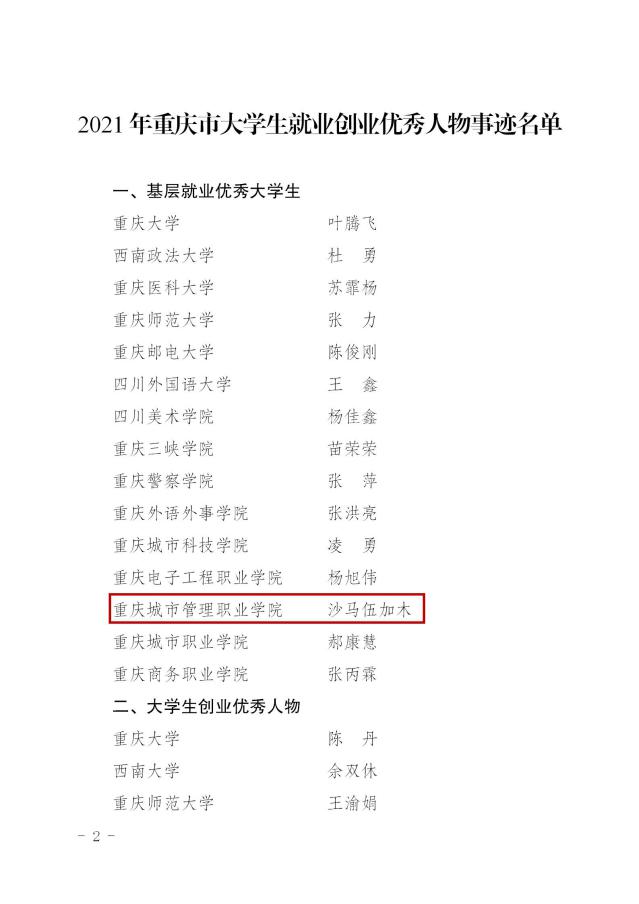 7月5日,重庆市教育委员会印发《关于公布2021年重庆市大学生就业创业优秀人物遴选结果的通知》,公布45名“2021年重庆市大学生就业创业优秀人物事迹名单”。我校智慧康养学院康复治疗技术专业毕业生沙马伍加木被评为“基层就业优秀大学生”、文化与旅游学院人物形象设计专业学生陈佳乐被评为“优秀军营大学生战士”。