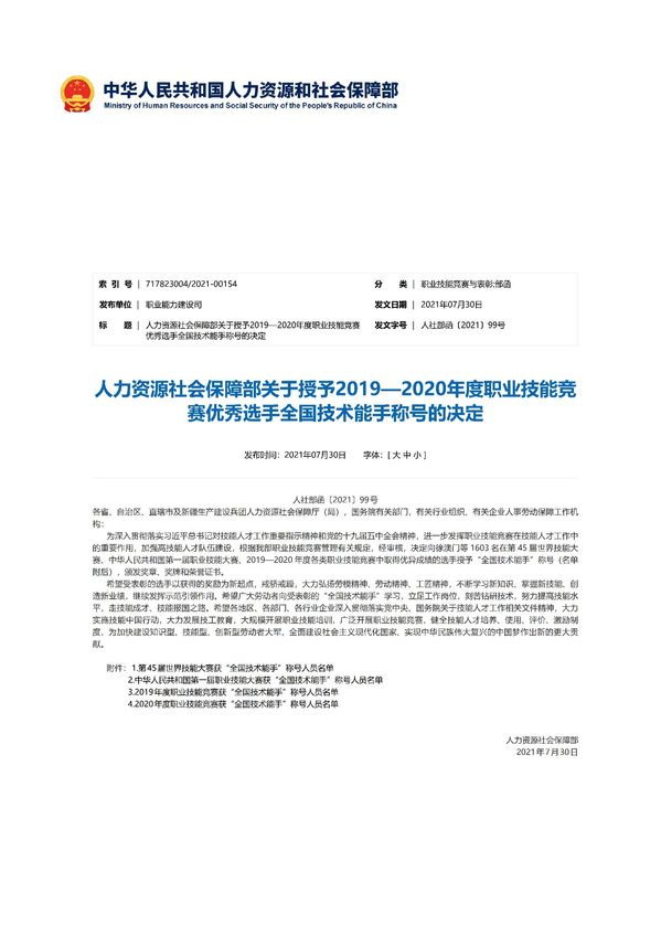 近日,中华人民共和国人力资源和社会保障部印发《关于授予2019-2020年度职业技能竞赛优秀选手全国技术能手称号的决定》(人社部函〔2021〕99号),向在第45届世界技能大赛、中华人民共和国第一届职业技能大赛、中华人民共和国第一届职业技能大赛、2019—2020年度各类职业技能竞赛中取得优异成绩的选手授予“全国技术能手”称号,并颁发奖章、奖牌和荣誉证书。商学院连锁经营管理专业教师查克玲、朱云波,2020届“永辉学徒店长班”学员李欢在2020年全国行业职业技能竞赛—全国连锁经营行业职业技能竞赛决赛中同获职工组一等奖,根据人社部职业技能竞赛管理有关规定,经主委会报请人力资源和社会保障部核准,连锁经营管理专业师生同时被授予“全国技术能手”称号。